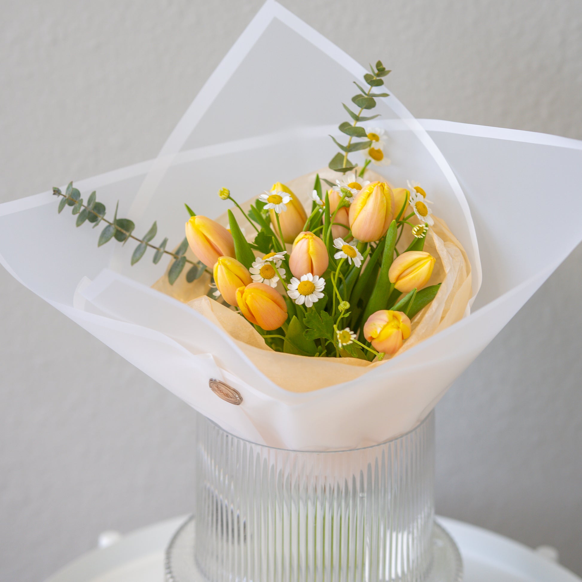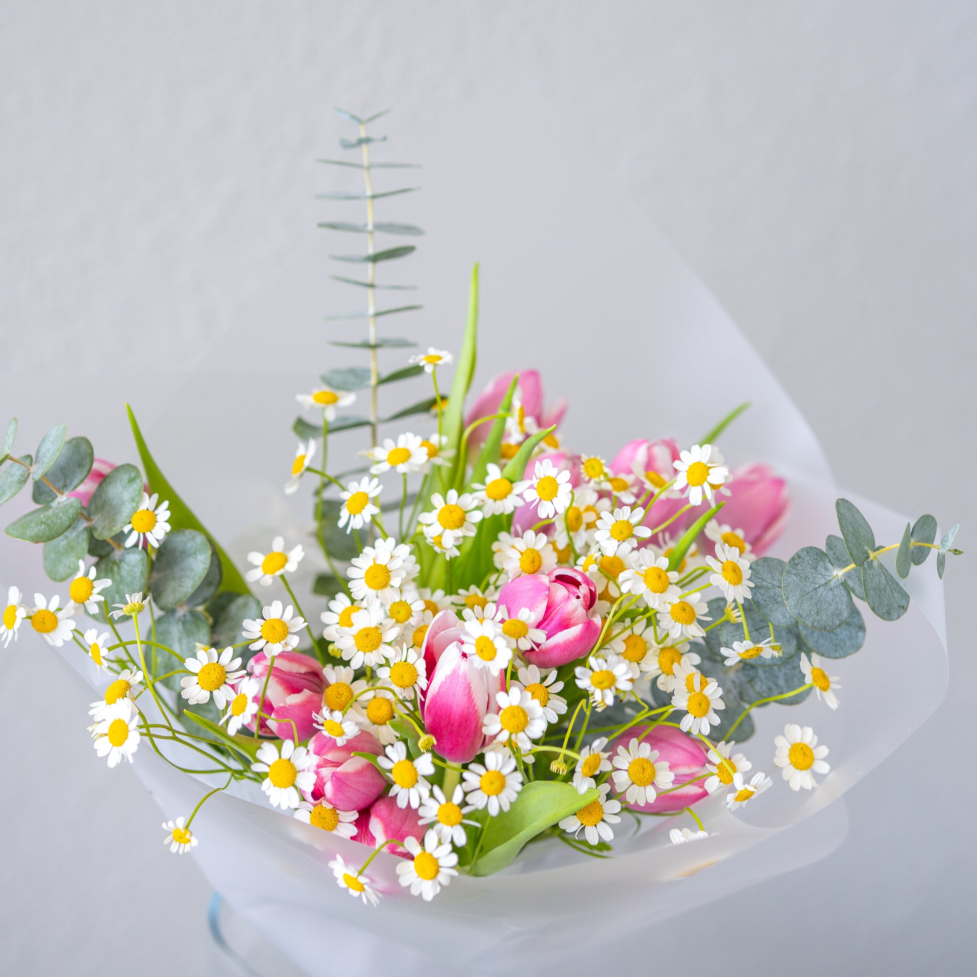 Discover the perfect harmony of nature's beauty with our bouquet featuring delicate camomile, vibrant tulips, and aromatic eucalyptus. Let the soothing scent of eucalyptus complement the sweet aroma of camomile and the lively presence of tulips, bringing joy in every stem.