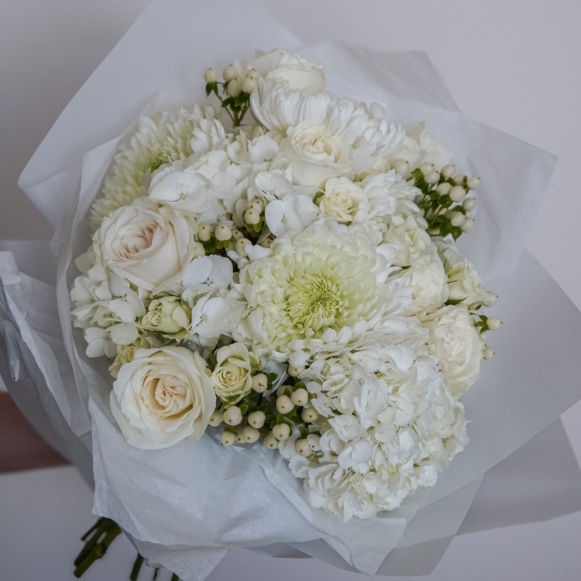 A dreamy arrangement mix of soft white roses and hydrangeas beautifully wrapped to create an ethereal and elegant look. This bouquet exudes purity and grace, making it a perfect choice for birthdays, anniversaries or heartfelt gestures of love and appreciation.